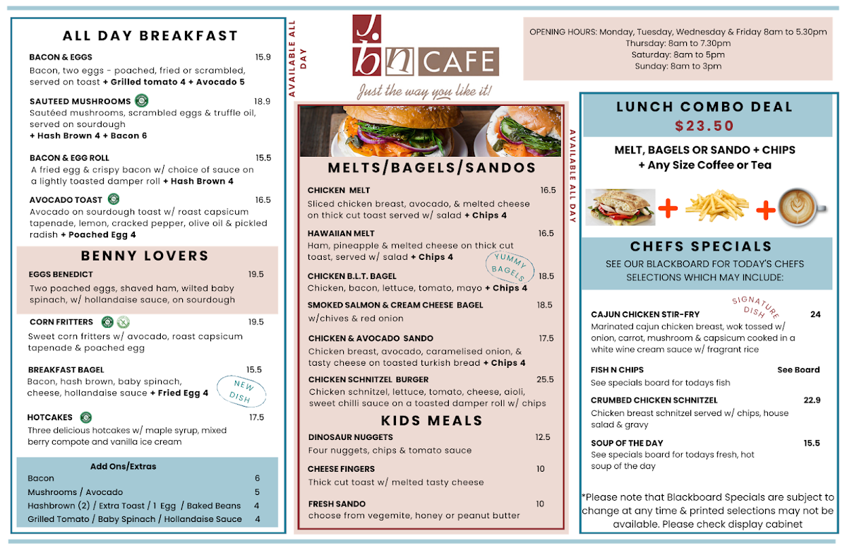 Welcome to JBN Cafe, a delightful culinary spot nestled in Coffs Harbour, Australia. This charming cafe offers a menu that tantalizes every palate, from kids to adults. Start your culinary journey with our Kids Meals like the entertaining Dinosaur Nuggets or the comforting Cheese Fingers, perfect for little ones.